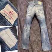 モデル名21YEARS-REPAIRの通り、やや穿き古してダメージが多いリペア加工が施してある一本です。アクセントやはずしのアイテムとしてもオススメです。このブランドらしい、細部にまでこだわりを感じられる仕上がりです。