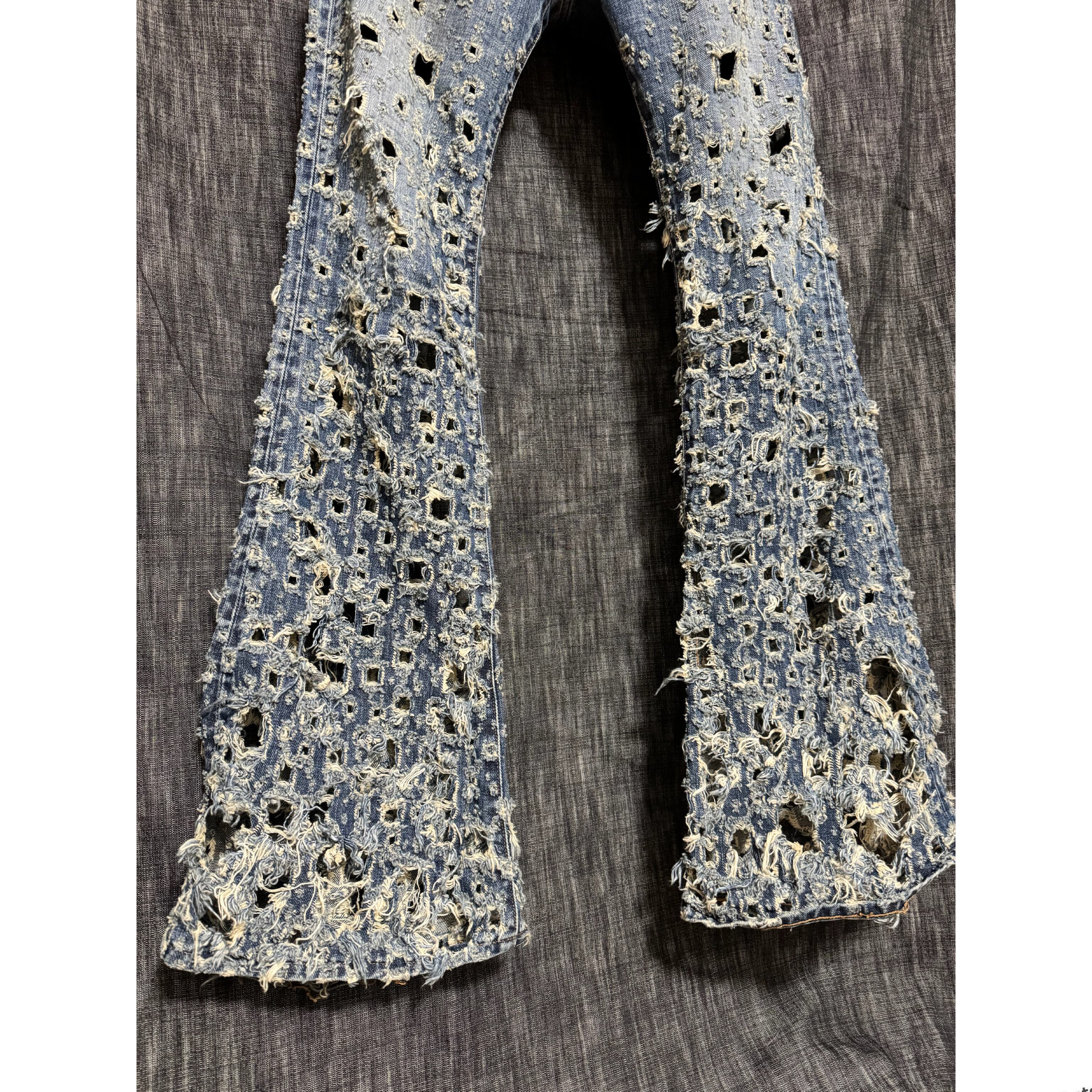 SUGARHILLのこのデニムは、"Modern Denim"という新たにブランドが「現代的なデニム」として位置づけるシリーズとして制作されたオリジナルのデニム生地を用い、そこから更にヴィンテージライクなフェード加工と、まるで車に轢かれたかのようなレーザーによるダメージ加工が施されている。