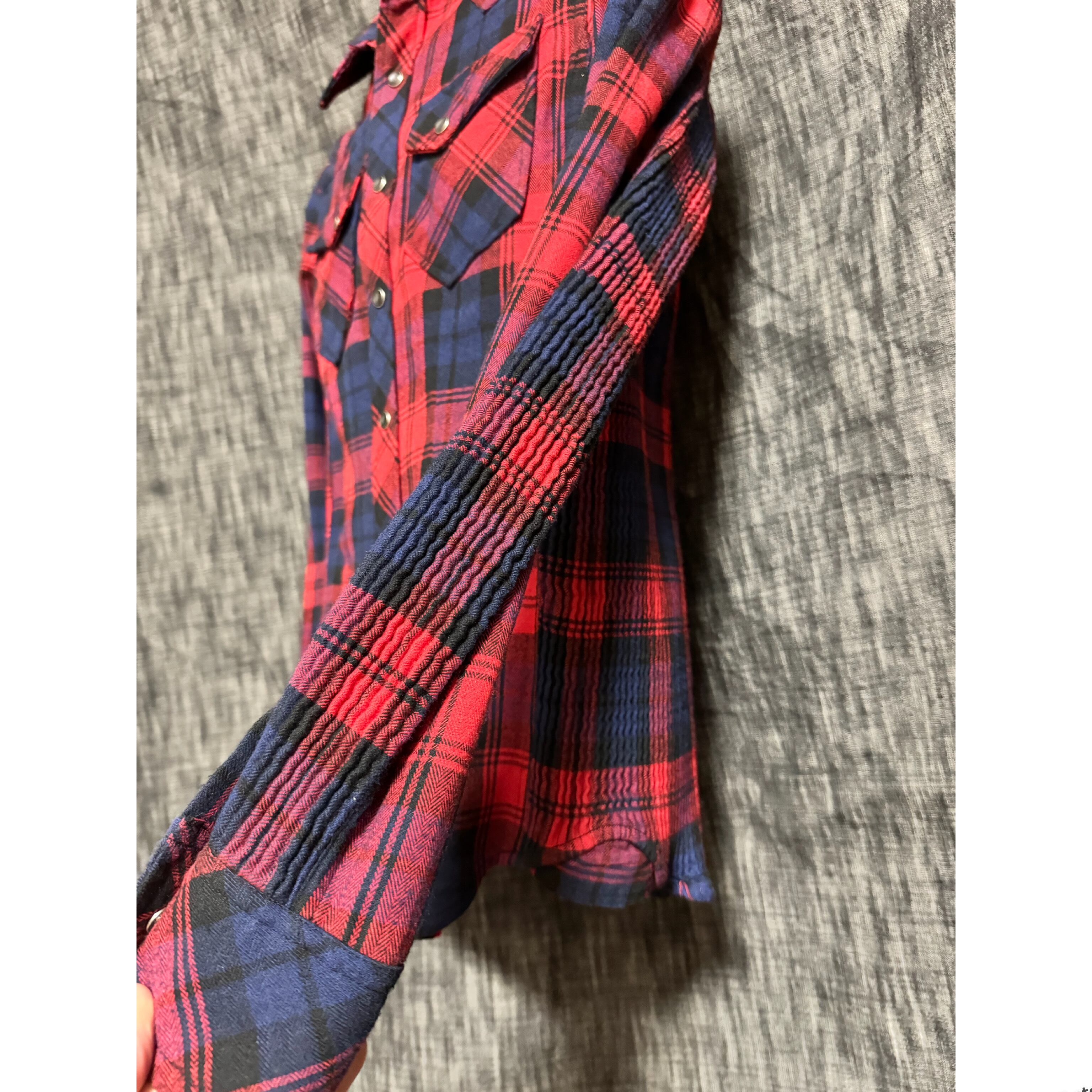 両脇から袖にかけてジャバラのようなデザインで別の生地を取り付けたチェックシャツ。釦はスナップ釦を取り付けることで、ウエスタン調な雰囲気も感じられる仕上がりになっています。細身のシルエットながらジャバラ部分に伸縮性もある為、着心地も良好。