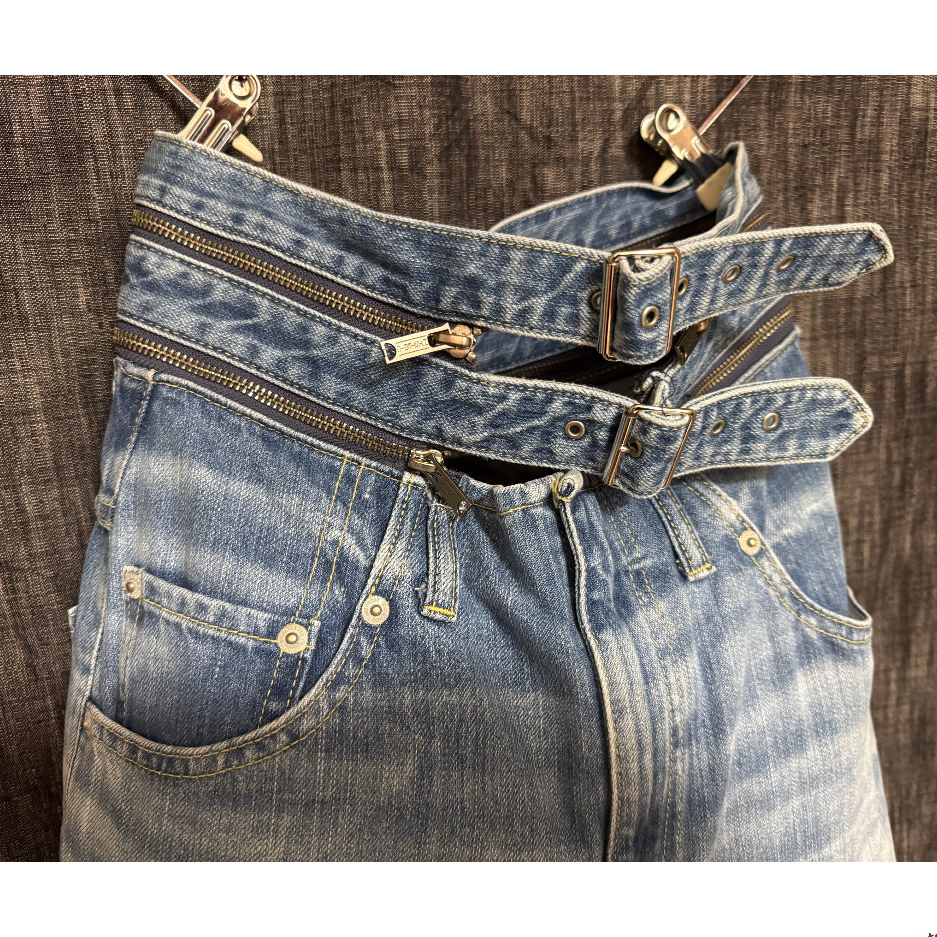 ファスナー金具がアクセントになった、ベルトが取り外し可能なデザインデニムパンツです。 外したベルトはベルト単体として使用でき、また本体のベルトループに通して使うことができたりと、コーディネートに合わせてバリエーションを楽しんで頂けます。 ※11.5oz OLD BLUE デニムシルケット 60年代をイメージしたOLD BLUEの染めムラ形状を再現したタテ糸を使用し、右綾(3/1)に織り上げ、最後に生地の毛羽感を抑える仕上げ加工を施したオリジナルデニムです。
