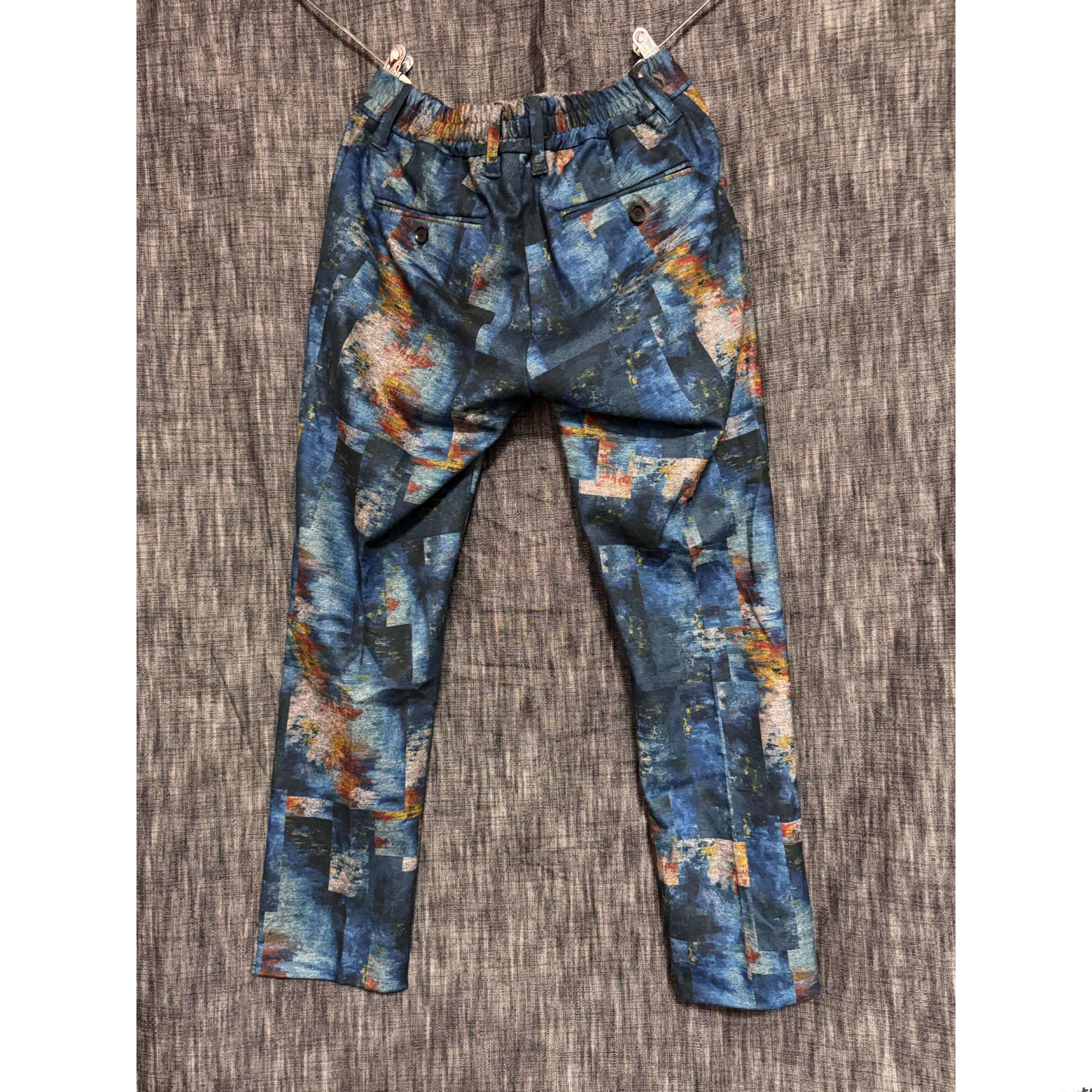 アブストラクトアートをモチーフに大小様々な大きさに変えて、パッチワーク風にコラージュして組み合わせた柄をプリントしたイージーパンツ。ジャージー素材を採用し、すっきりとしたテーパードシルエットながら快適な履き心地を実現。青を基調とした色鮮やかなBLUE MIXとモノトーンのカラーグラデーションが印象的