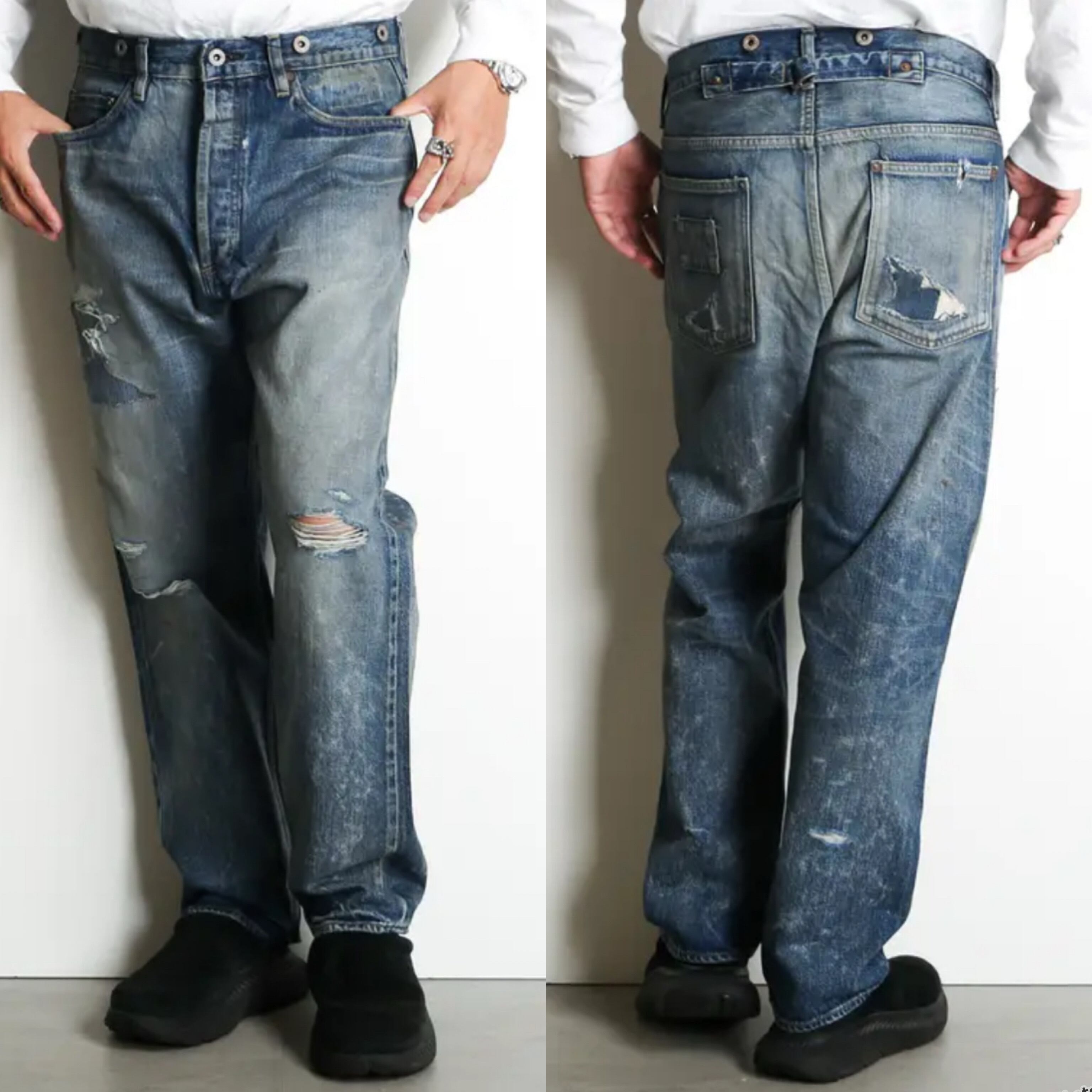 トップ、ウエスト箇所に配置したネオバは錆加工を施した月桂樹ボタンを採用。レッグの表裏にダメージ加工、股部分のヒゲ、膝裏のハチノス、裾・サイドシームのパッカリングなど、ヴィンテージさながらのムードに仕上げたマッドネスが誇る加工デニムの最高峰クオリティ。腰中央にシンチバック、左ヒップポケットにスクウェア型ネームを一筆書きステッチで付属。ウエスト・レッグにゆとりのある裾にかけてテーパードしたシルエット。