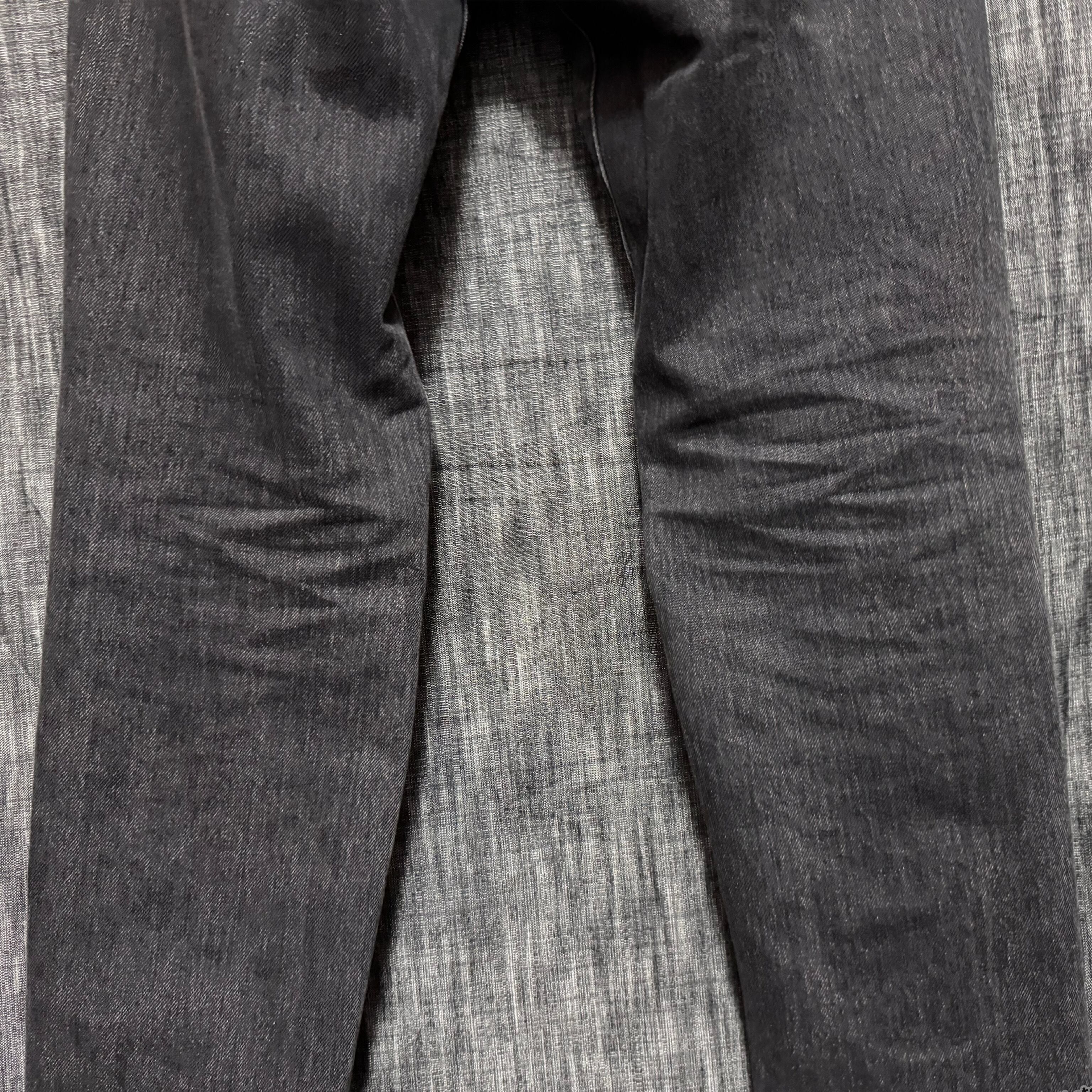 フロントジップデニムパンツ。ブラックにはストイックな表現をするためのストーンウォッシュを施し、グレーには手作業で生地表面にブリーチ加工を施している。