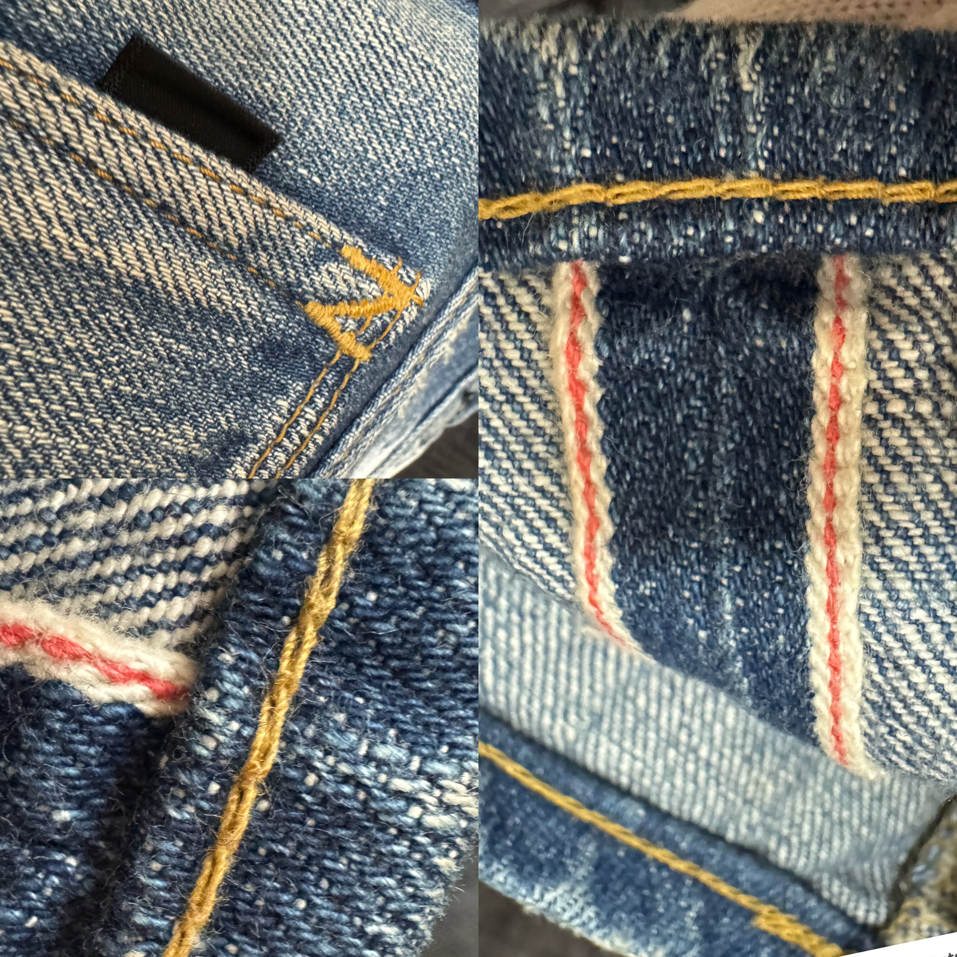 セルビッチデニムは旧式のシャトル織機で丁寧に織られた生地で、両端に「耳」と呼ばれるほつれ止めが付いているのが特徴。赤耳が代表的で、生地は高密度で丈夫、穿きこむほどに美しい色落ちが楽しめる。ビンテージ感や経年変化を重視する人に人気です。