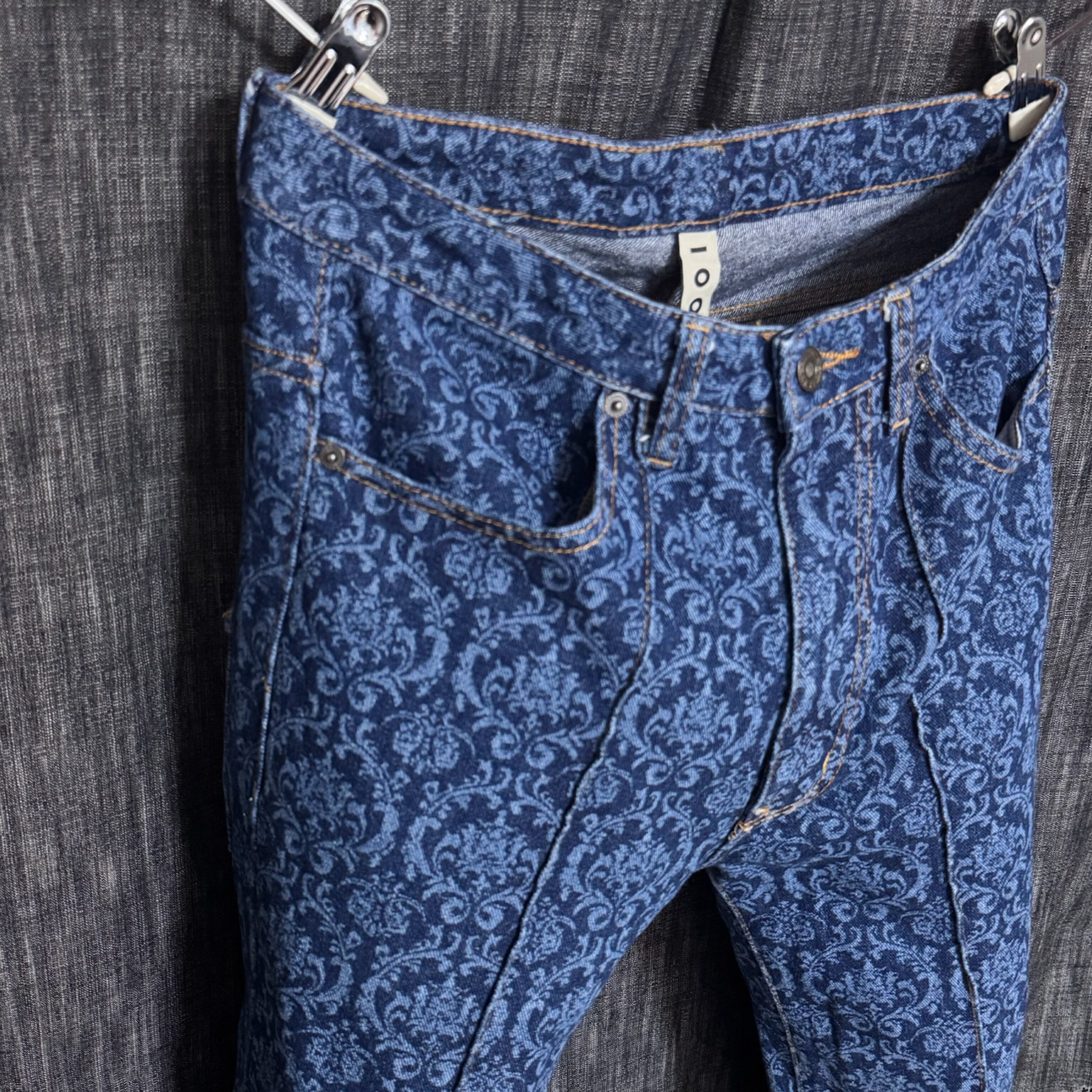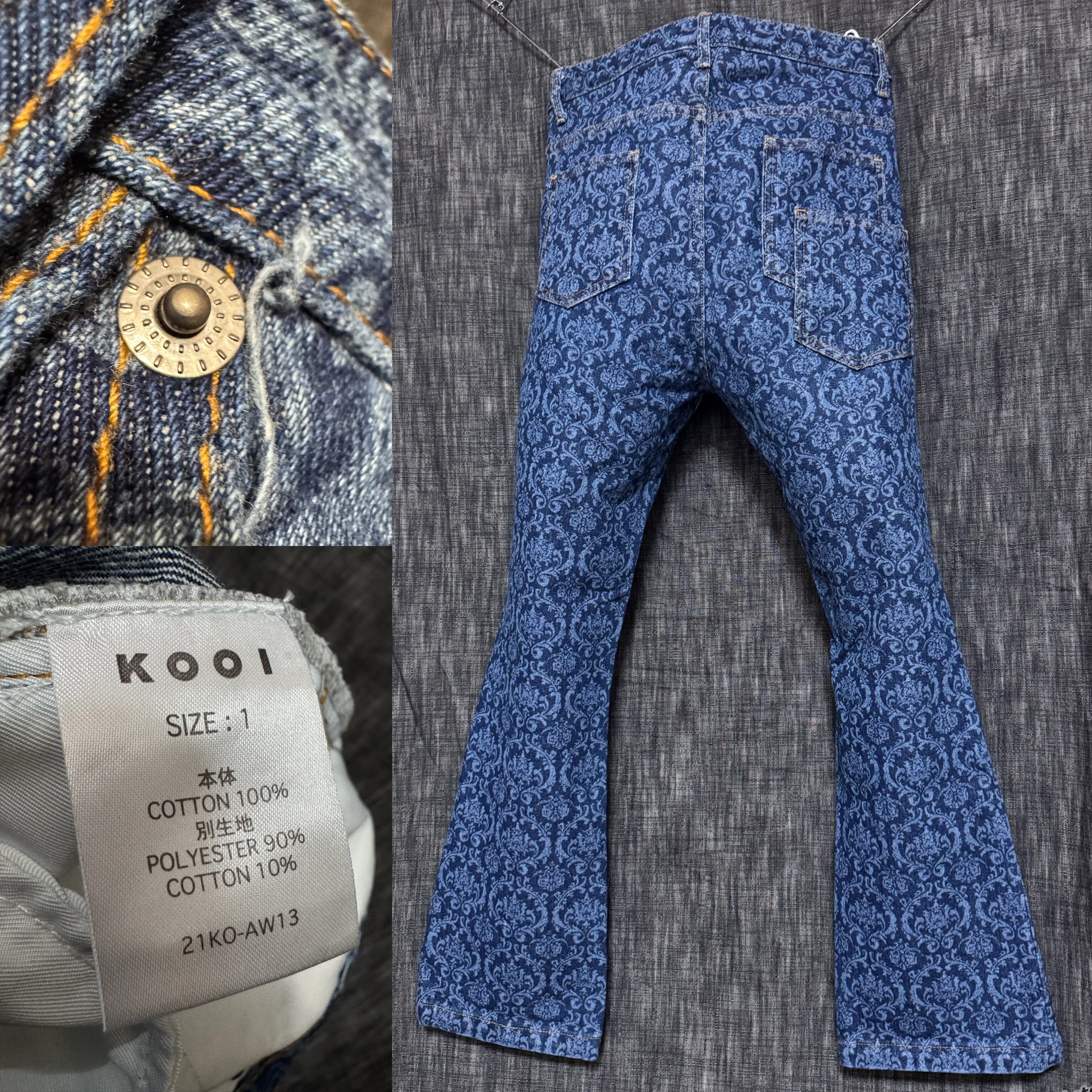 KOOI 総柄 ブーツカット デニム ジーンズ フレア 月桂樹ボタン インディゴ
