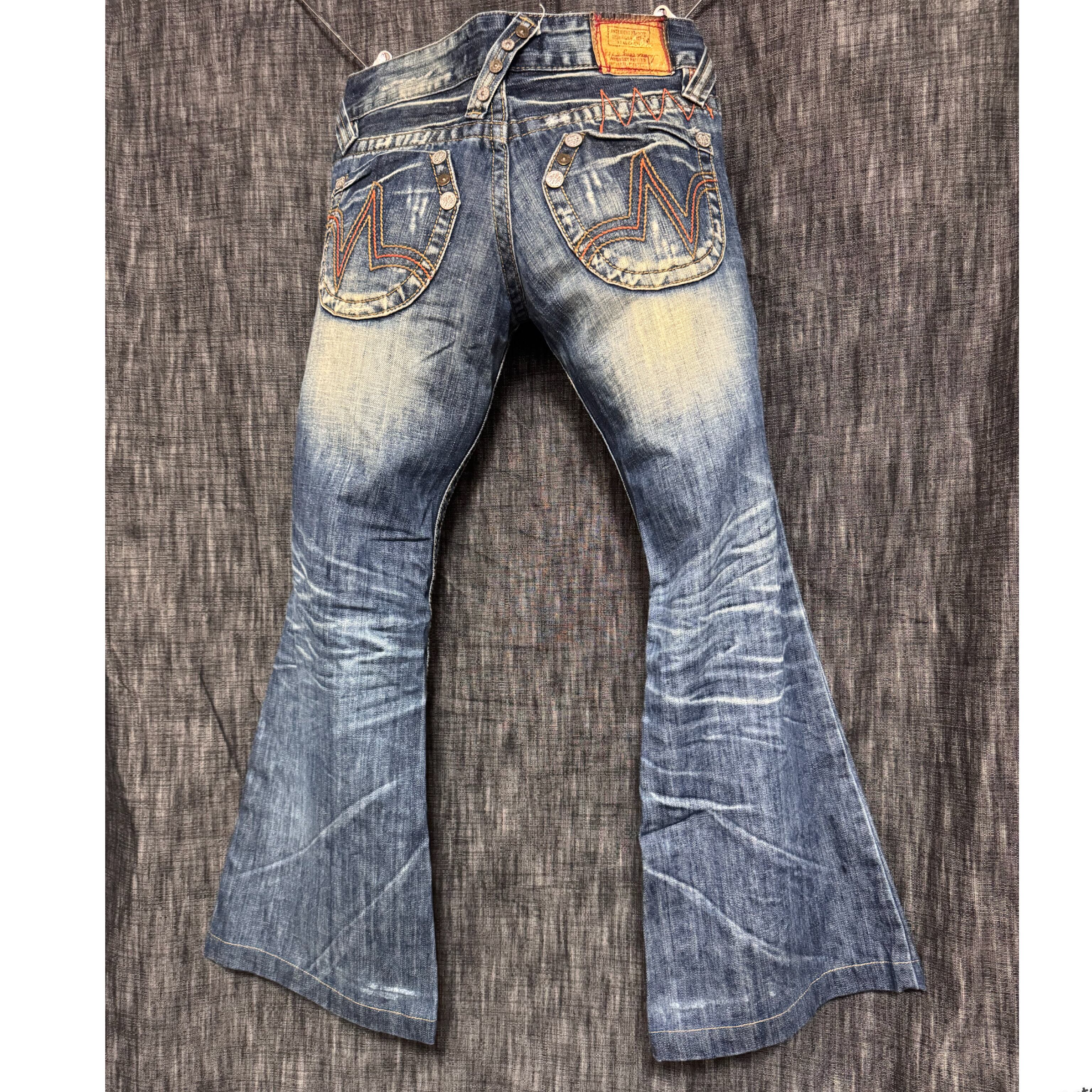 独自のヴィンテージ加工と大胆な刺繍デザインが特徴です。特にバックポケットやサイドに施されたスカルやフラワーモチーフの刺繍、ジッパーやワッペンなどの装飾がかなり目を引きます。これらのデザインは、2000年代のY2Kファッションや平成文化を彷彿とさせ、当時のストリートファッションを好む層に支持されています。 個性的でありながらも懐かしさを感じさせるデザインです。