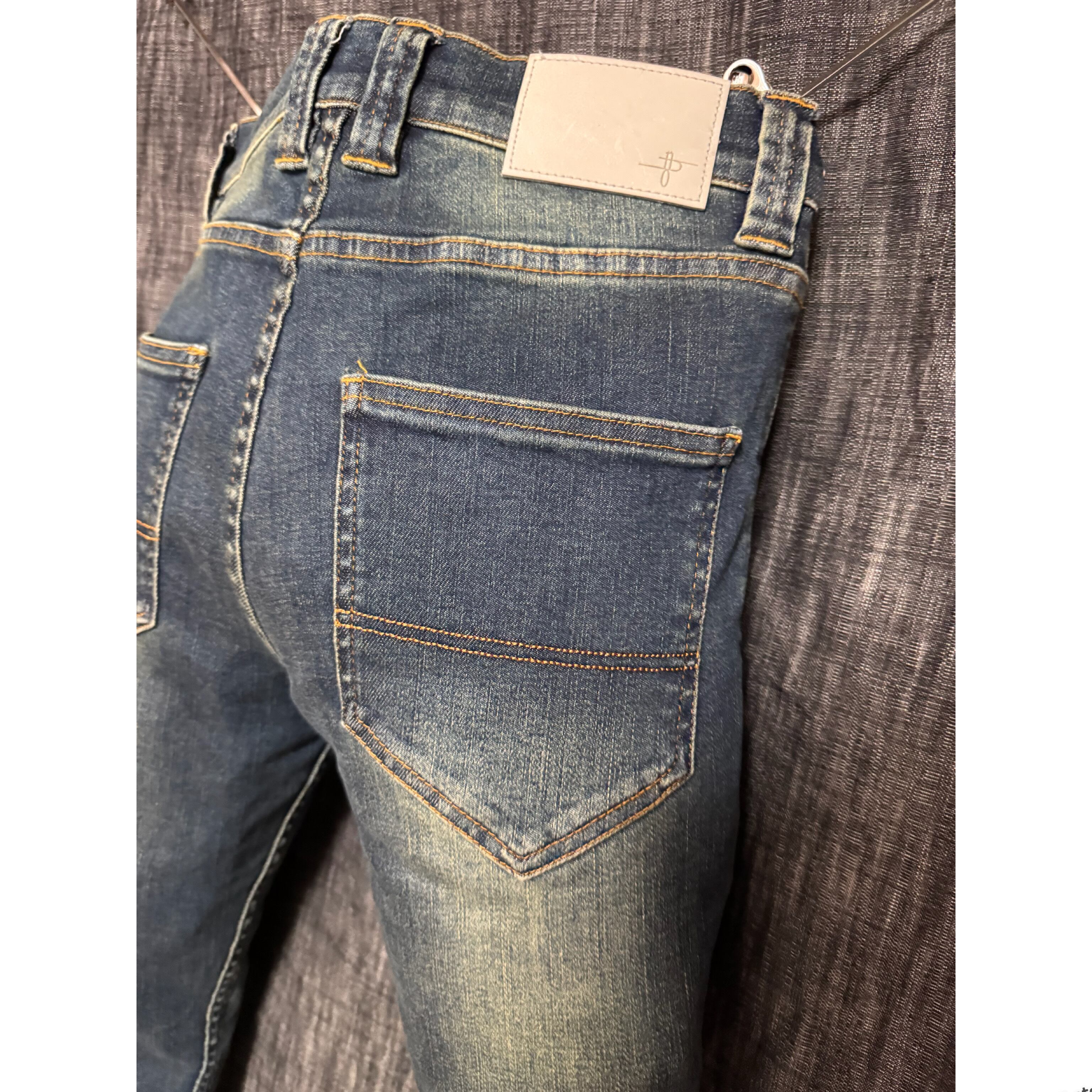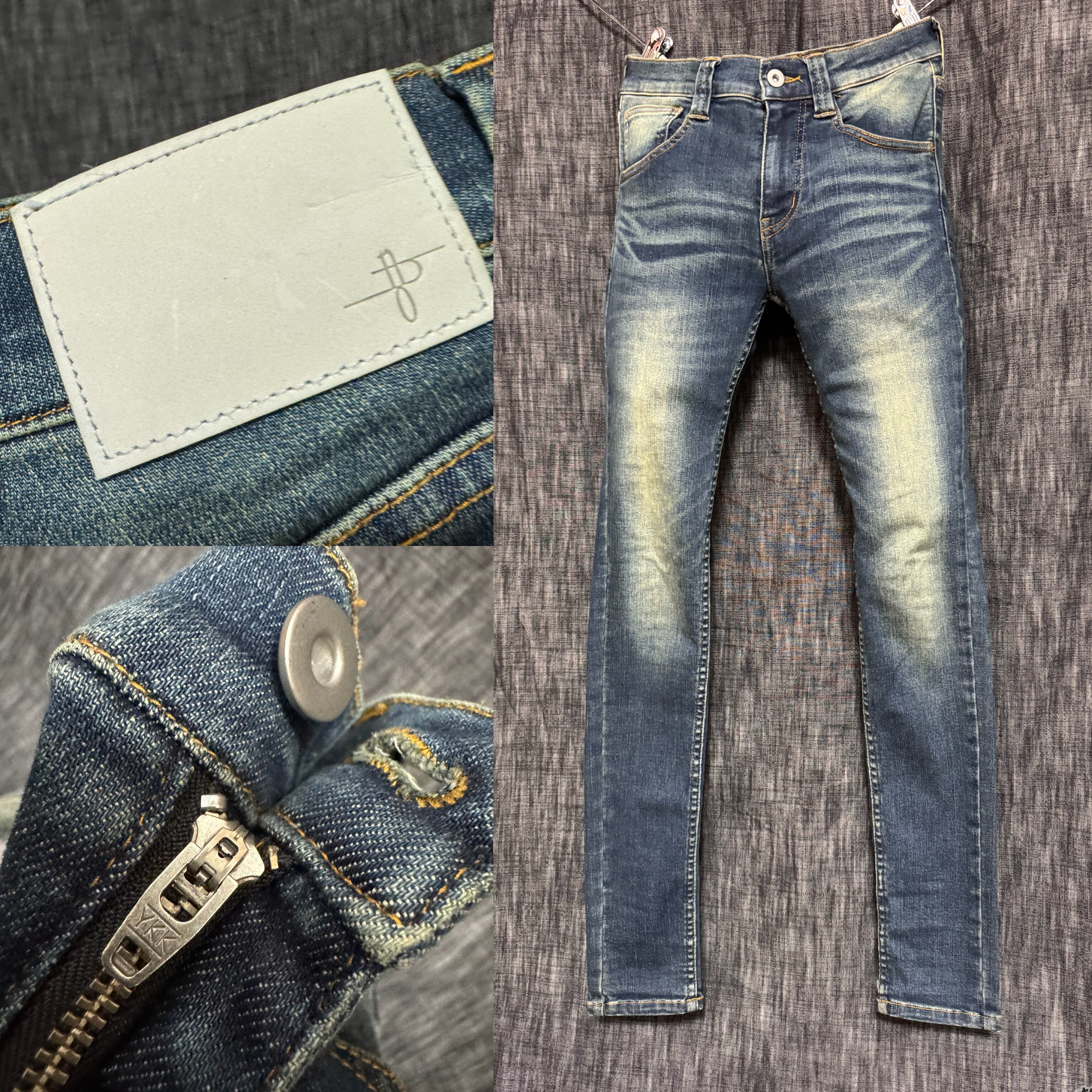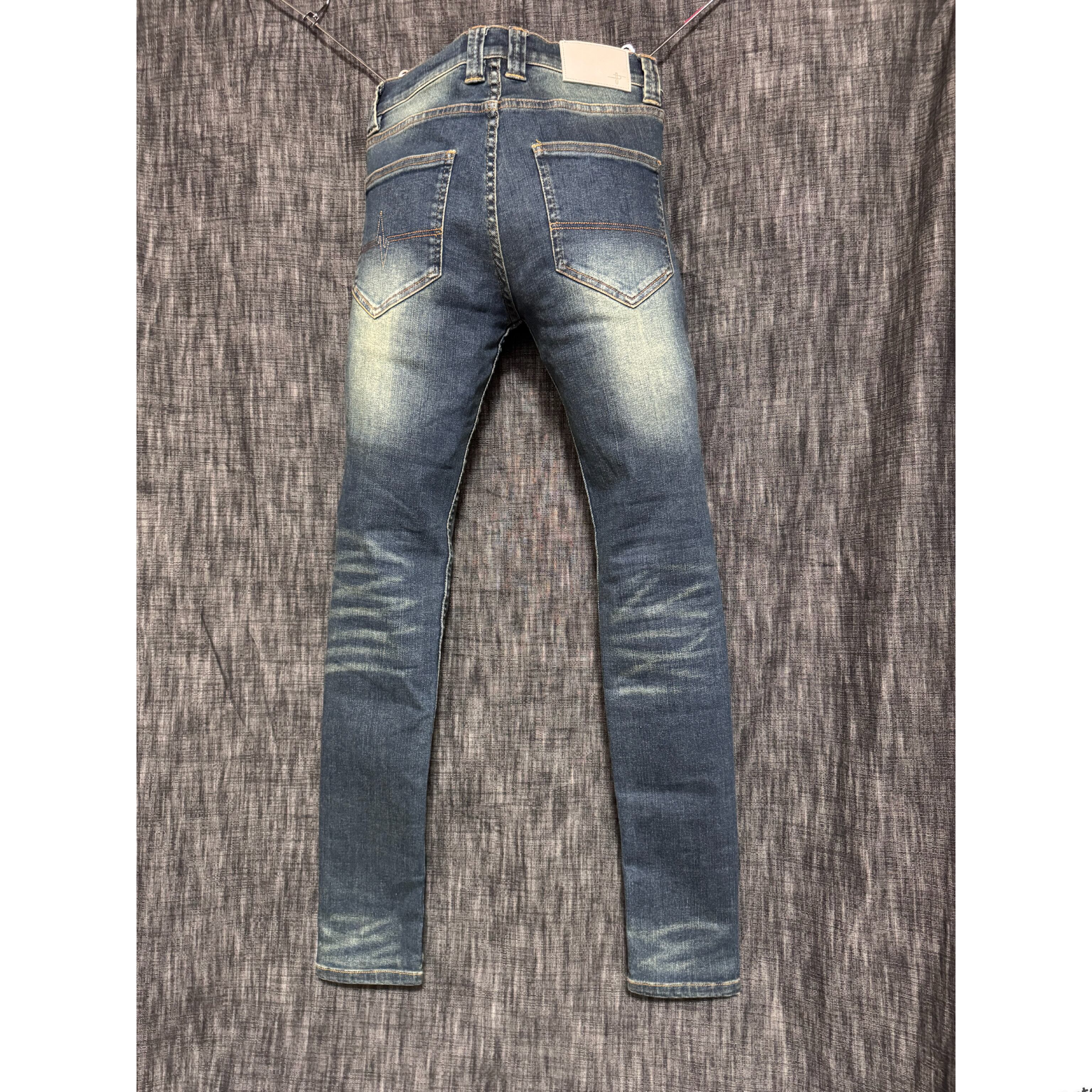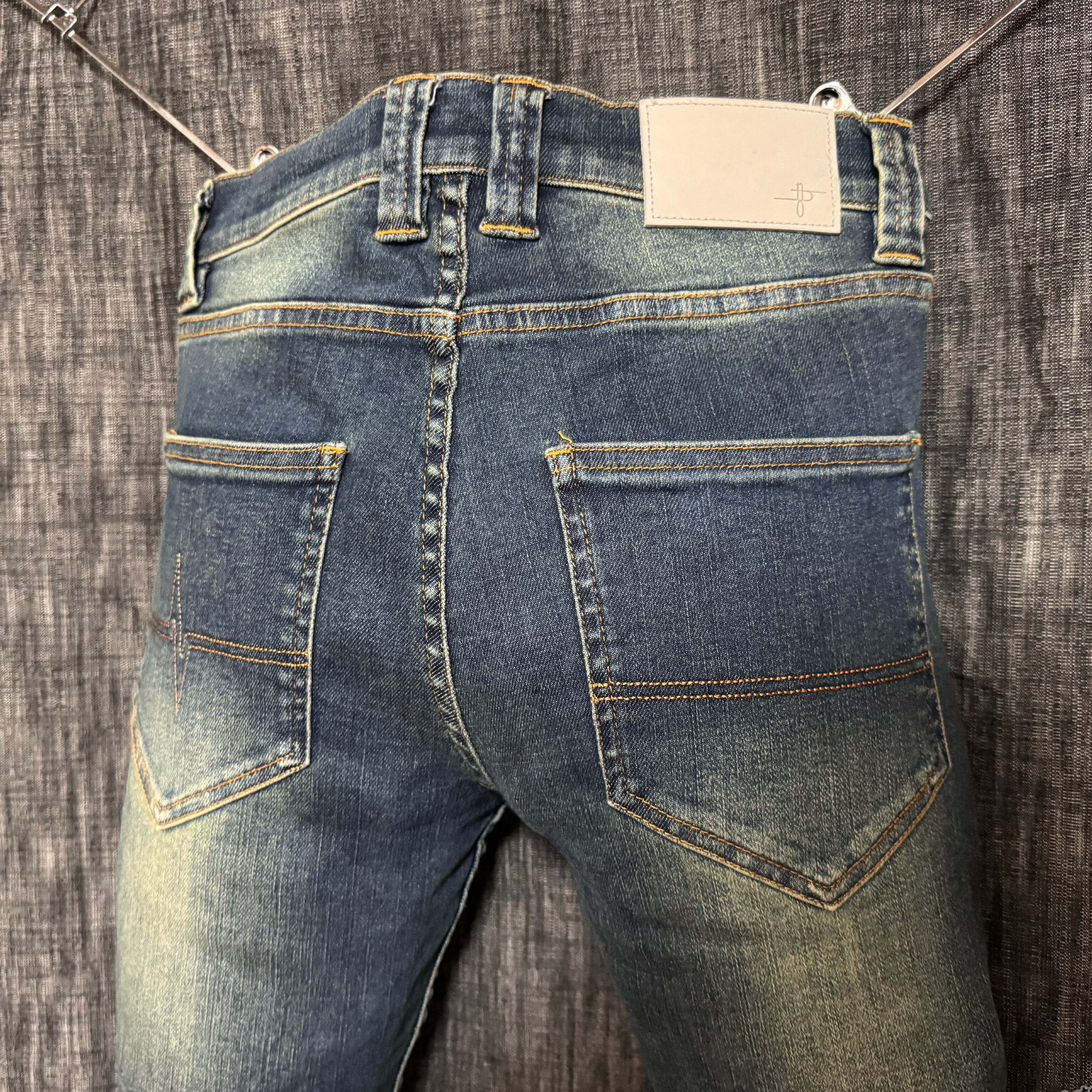 一般的なストレッチデニムの伸長率は15〜30%と言われており本作はそれを大きく超える96.8%の伸長率を誇る。その類い稀なるストレッチ性を活かし今までのストレッチスキニーデニムのサイズを見直し極限にまでサイズを削り究極のタイトスキニーを作成。普遍的な5ポケットのベーシックなデザインはトレンドに流されないスタンダードな一本に初めから履き古した様なユーズド感を表現。
