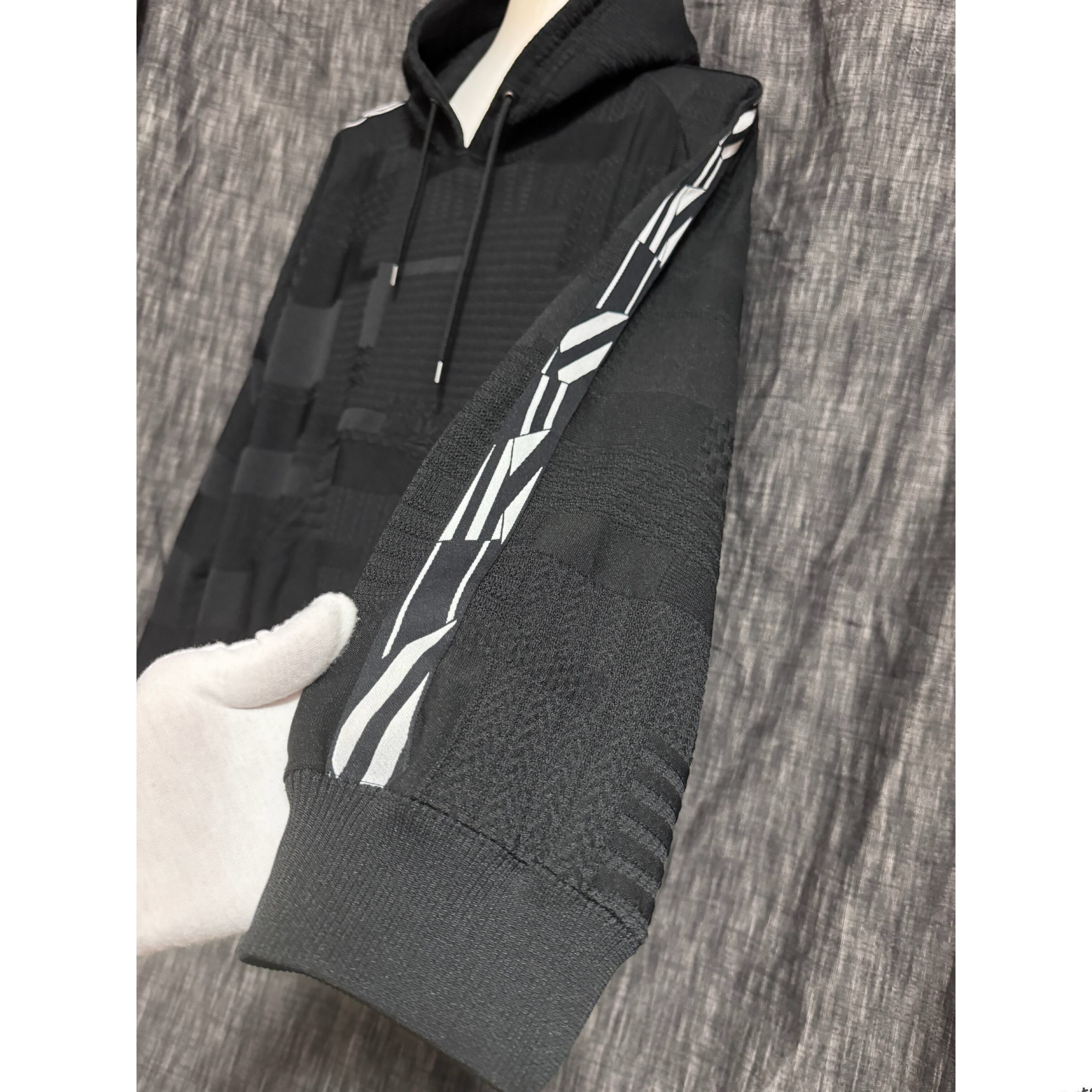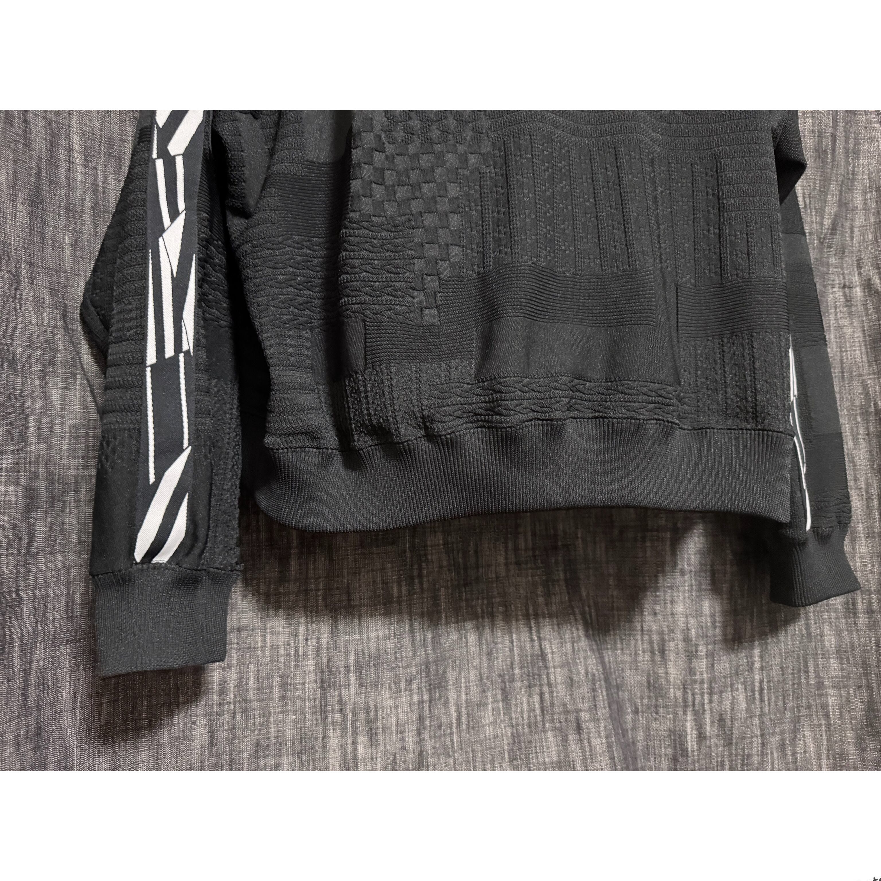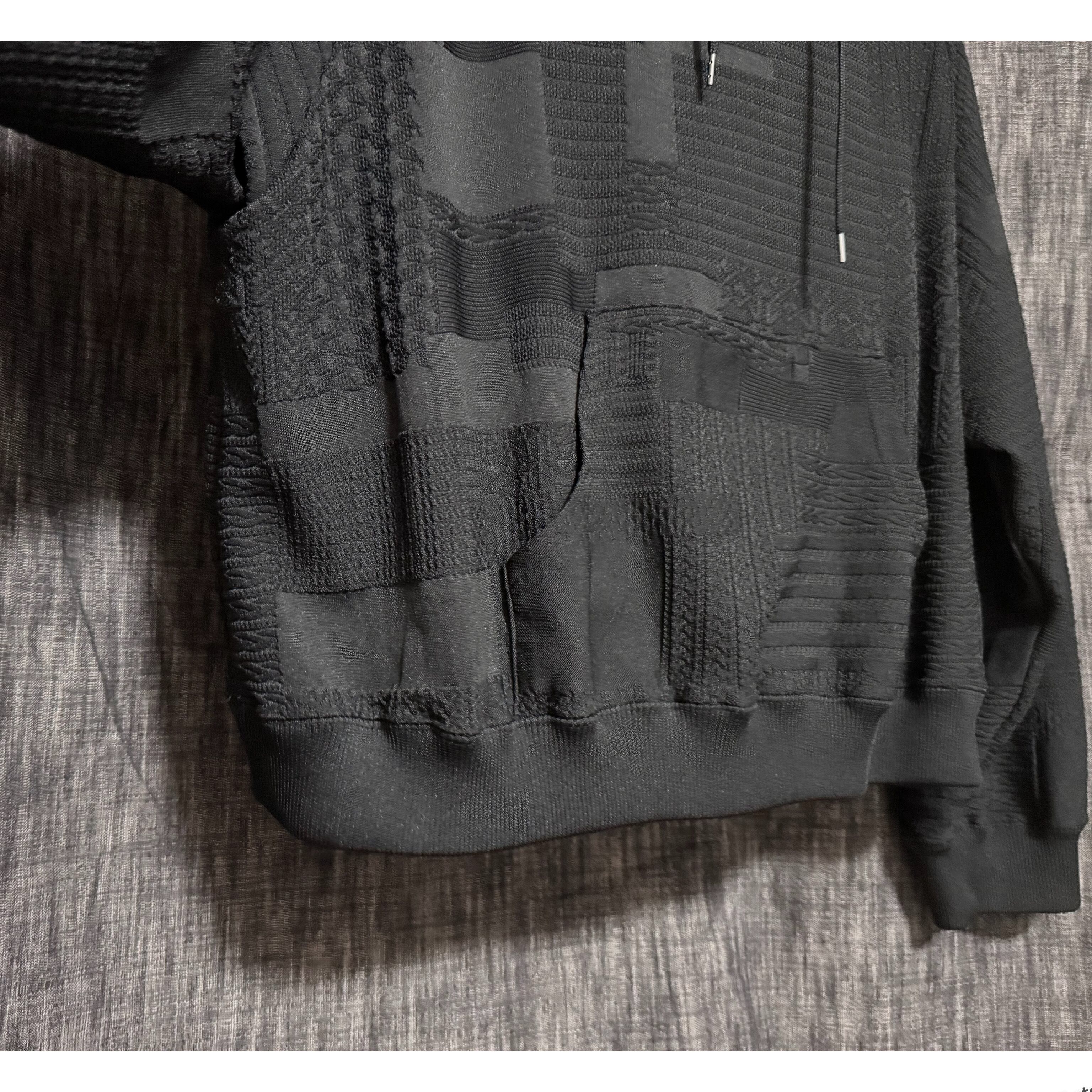 15種類にも及ぶ、編みの異なるジャガード柄を複雑に組み合わせたパッチワーク生地で仕上げたフードトップスサイドには、太さの異なるラインを組み合わせてデザイン。