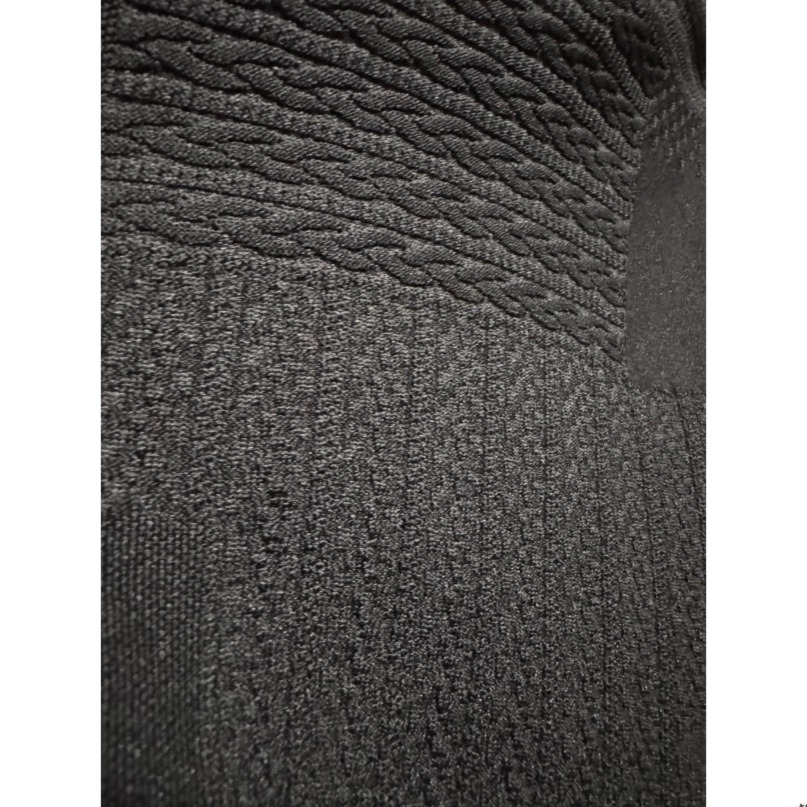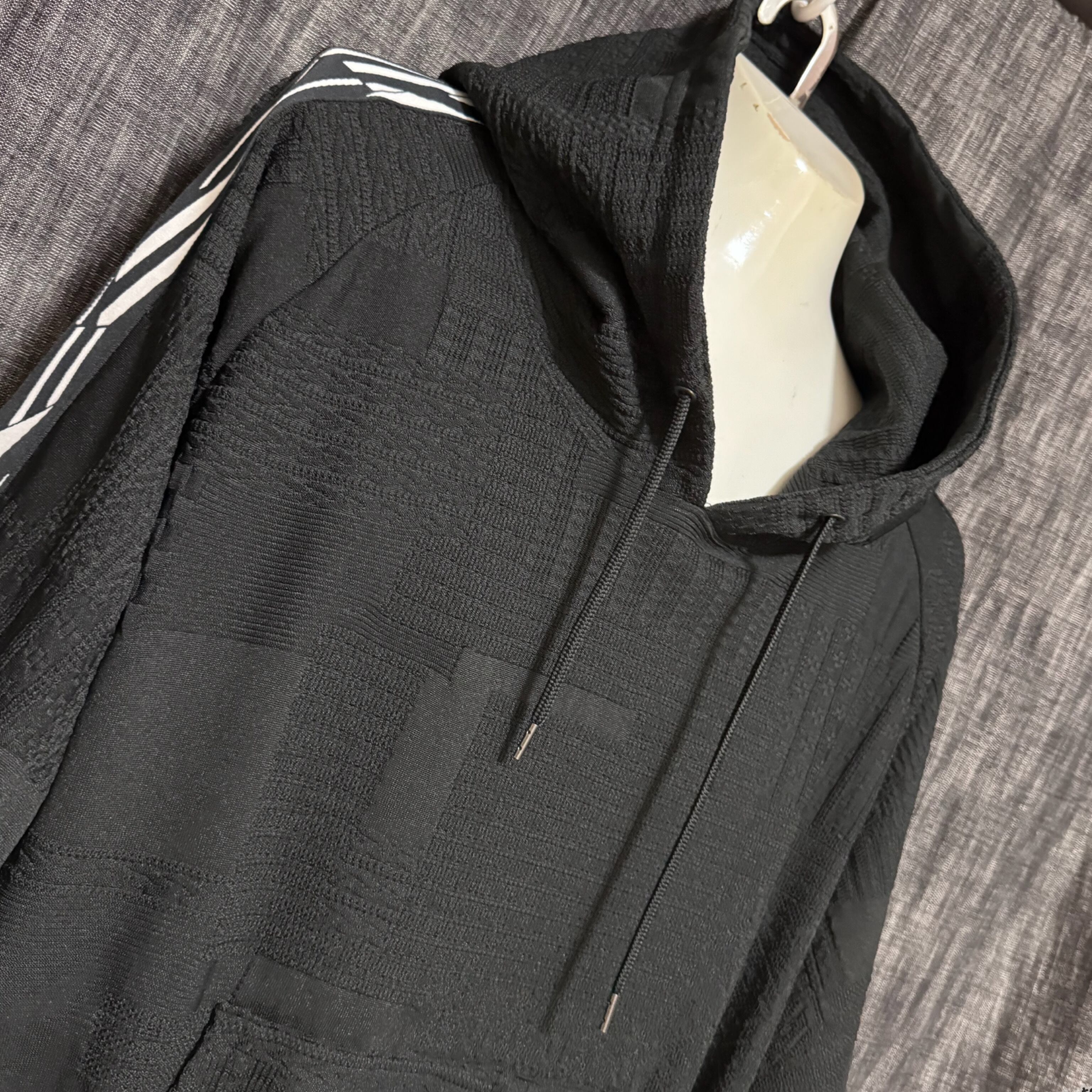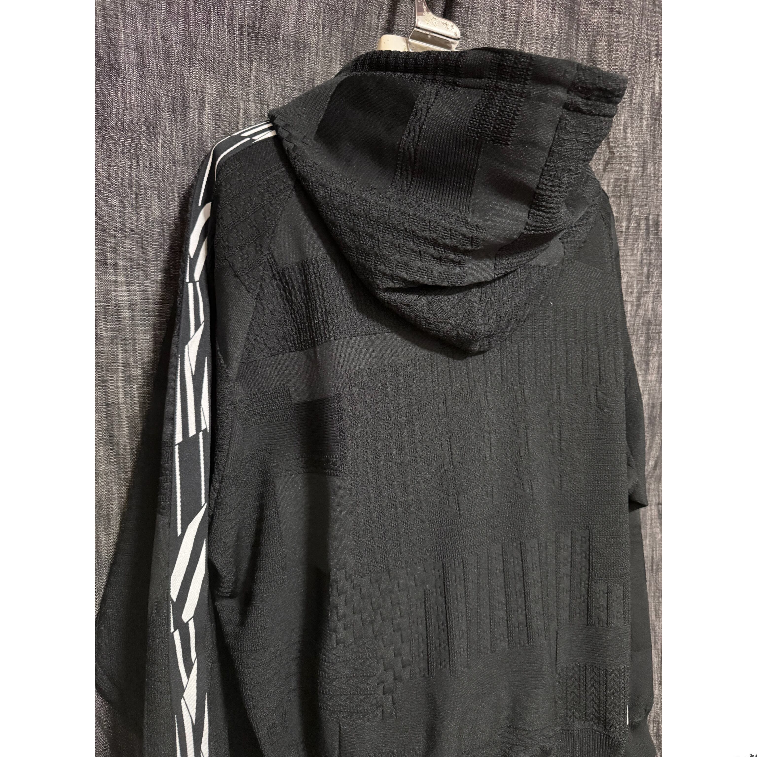 15種類にも及ぶ、編みの異なるジャガード柄を複雑に組み合わせたパッチワーク生地で仕上げたフードトップスサイドには、太さの異なるラインを組み合わせてデザイン。
