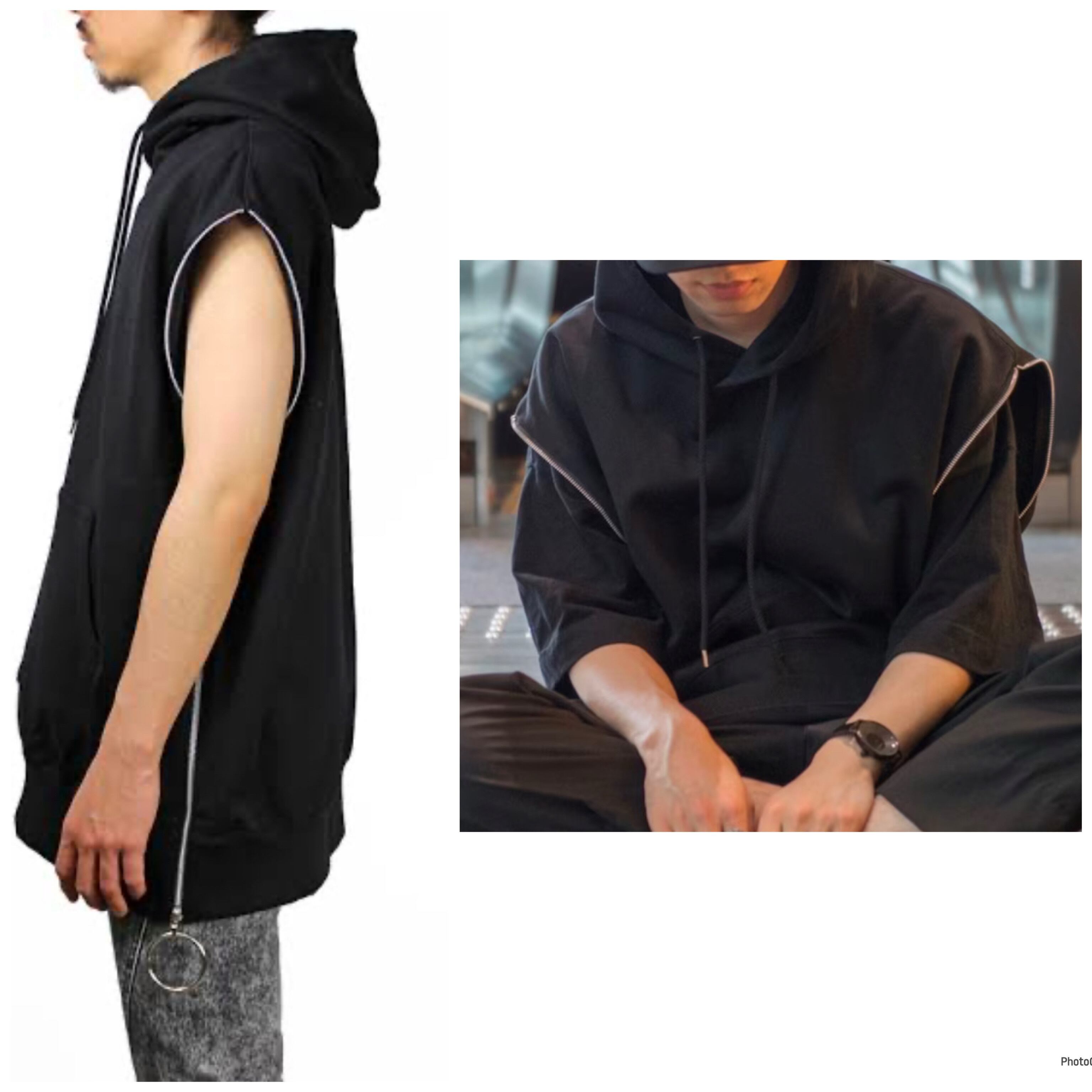 リングトップがアクセントになっているノースリーブパーカー。見頃のファスナーで袖の開き具合調整できる仕様になっています。